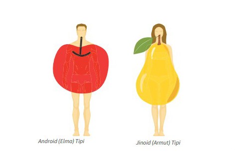 Yağ dokusunun bedenin üst bölgesinde, özellikle göbek çevresinde toplanması ile kendini gösteren vücut tipine elma veya android vücut tipi; vücudun alt bölümlerinde özellikle kalça ve uyluklarda depolanması ile baş gösteren vücut tipine ise armut veya jinoid vücut tipi denmektedir.