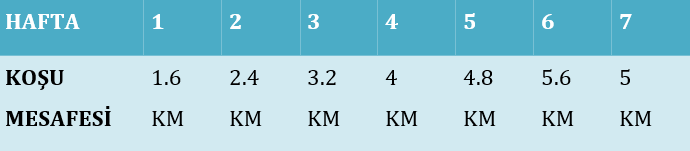 Yeni başlayanlar için genellikle 5 km koşuları eğlenceli, rahat ve sürdürülebilirdir. Aşağıdaki yönlendirmeyi takip ederek başlayabilirsiniz. Unutmayın “Koş-Yürü” yöntemini burada kullanabilirsiniz. Aşağıdaki plana 7 hafta sadık kalarak gelişiminizi takip edin.